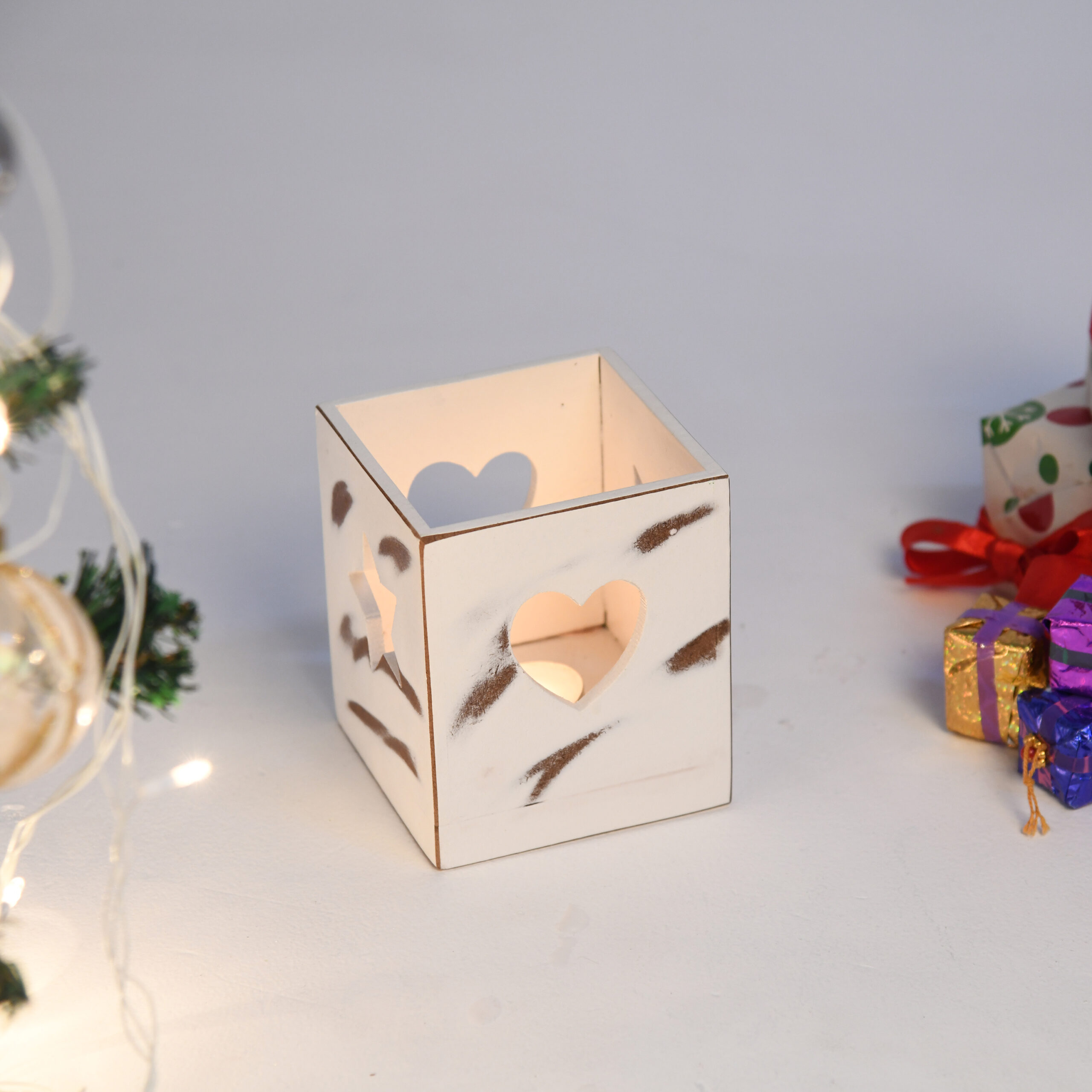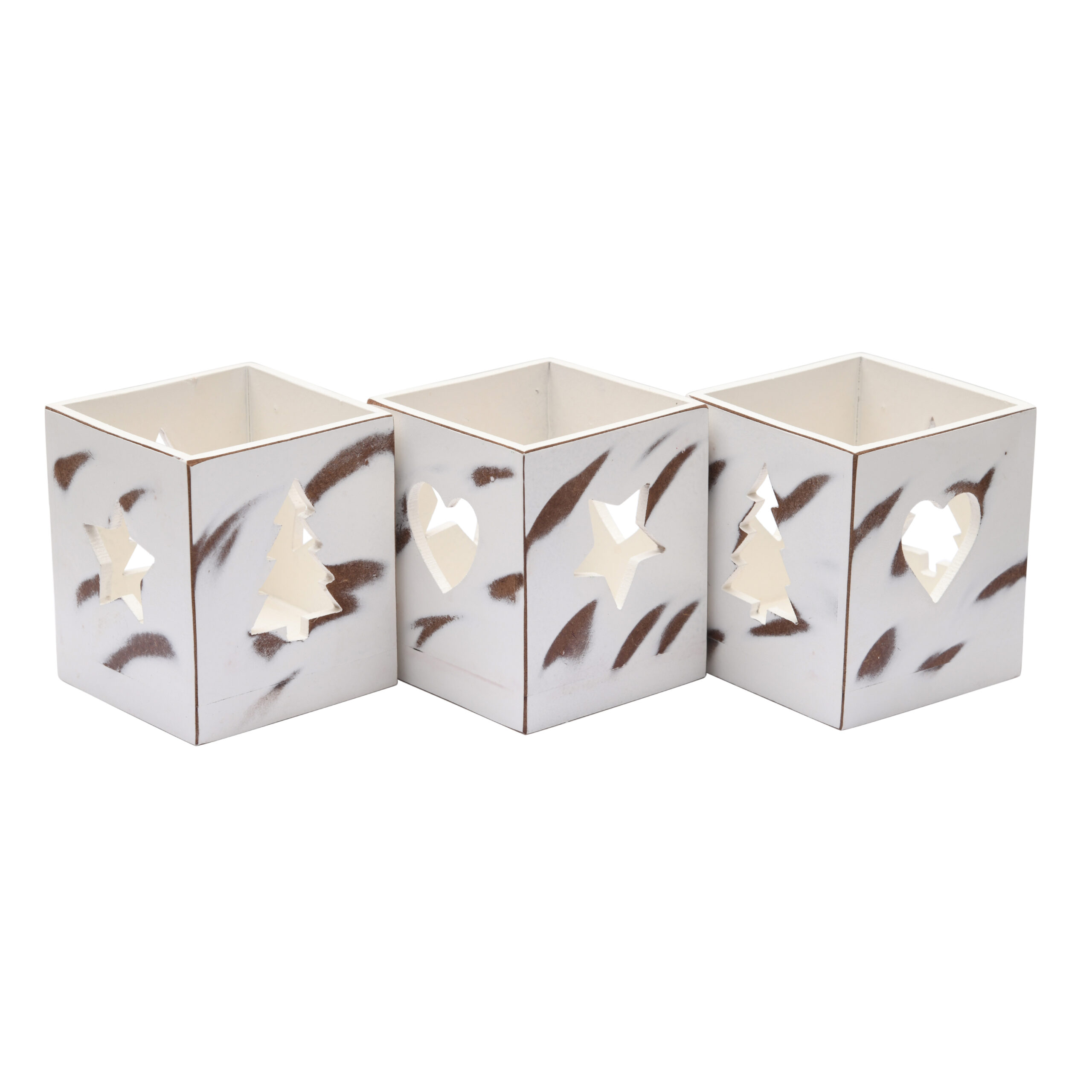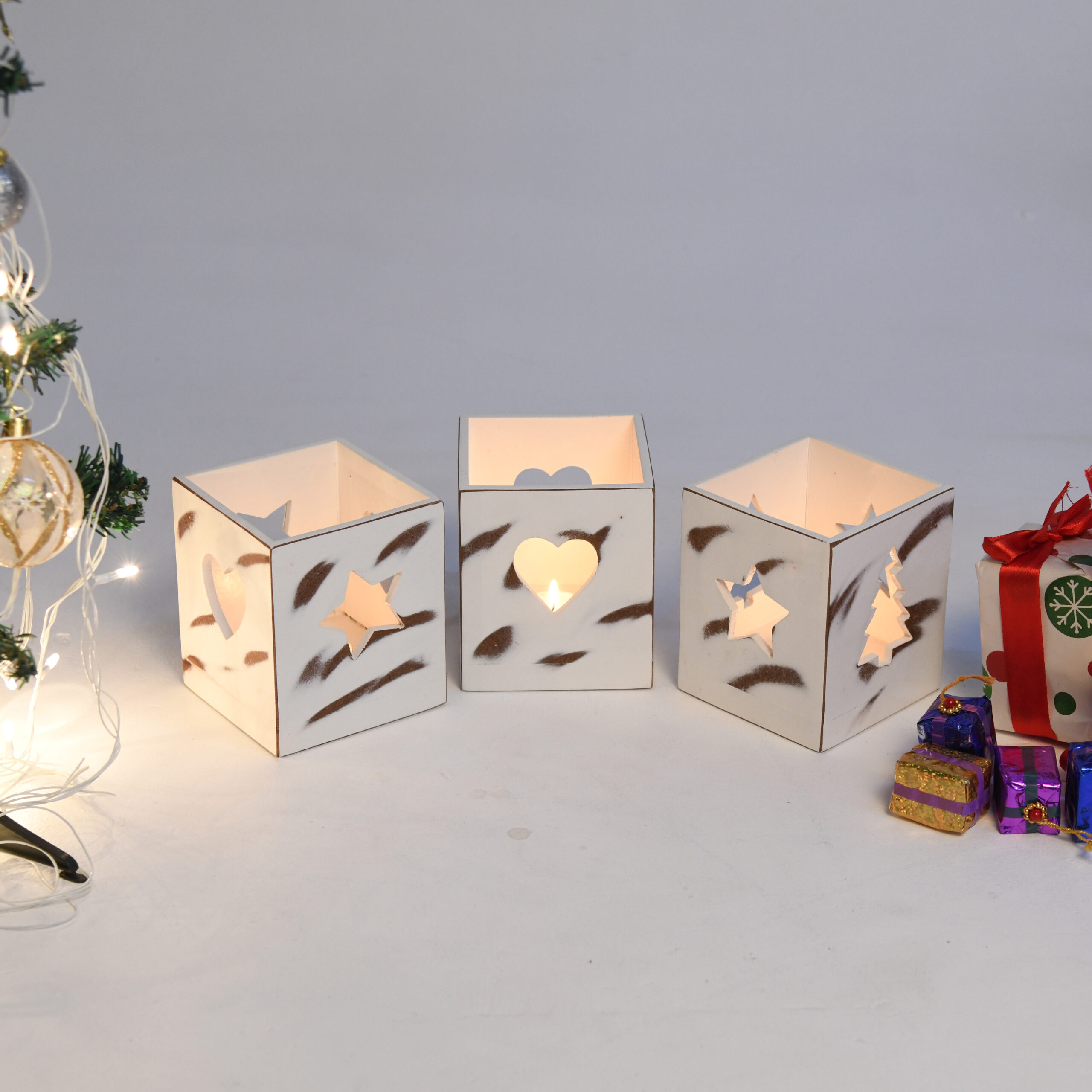 CRAFTMITRA Rustic 3 combo WHITE Tea Light Holder for indoor and Outdoor Decoration | HEART, Tree And Star Shaped Hole | WHITE Tea light Holder | Premium MDF | Wooden Base | Unique & natural Holder for Living Room Bedroom Office Storage Kitchen ( 3 Tea Light Holder ) ( 8L x 8W x 12H ) Cms