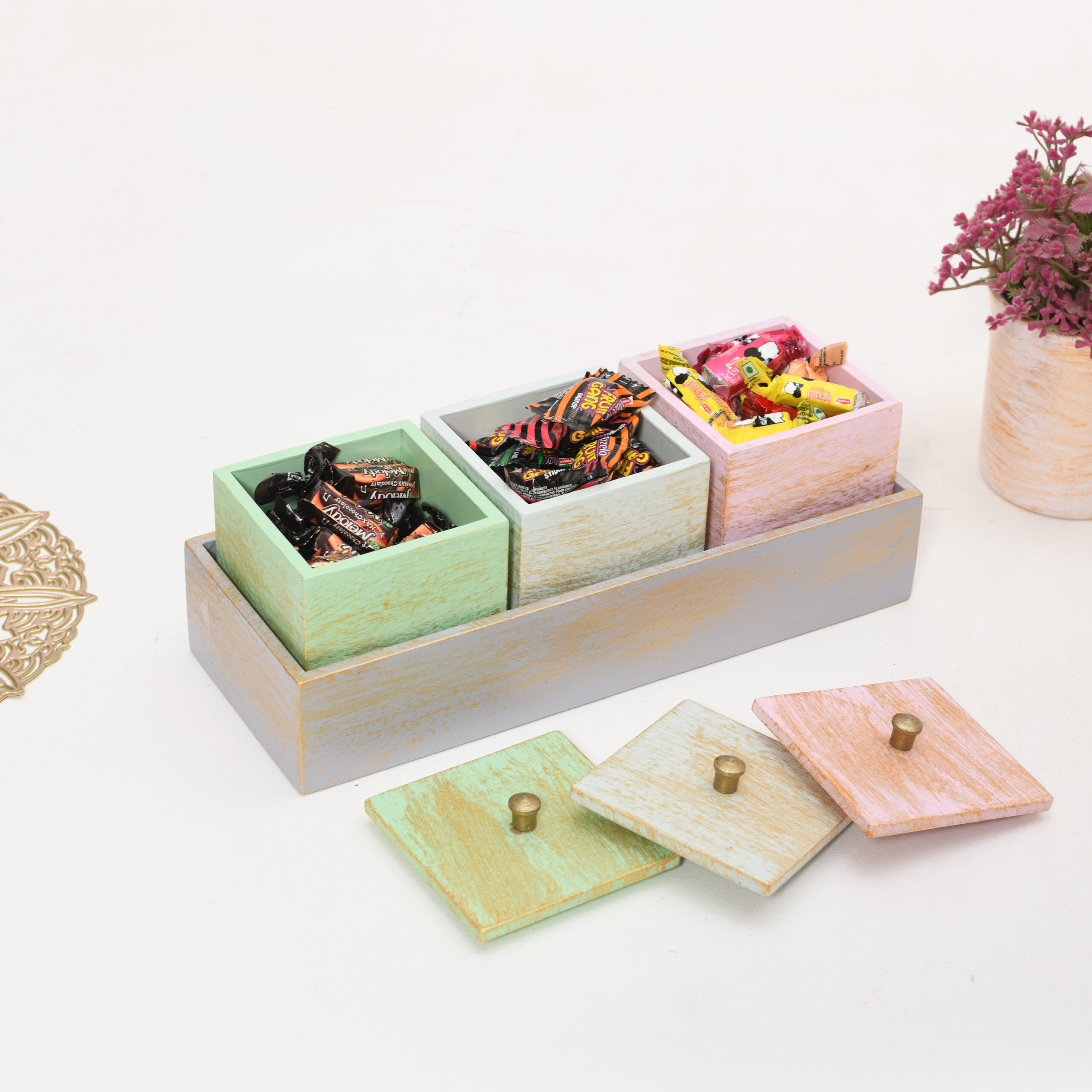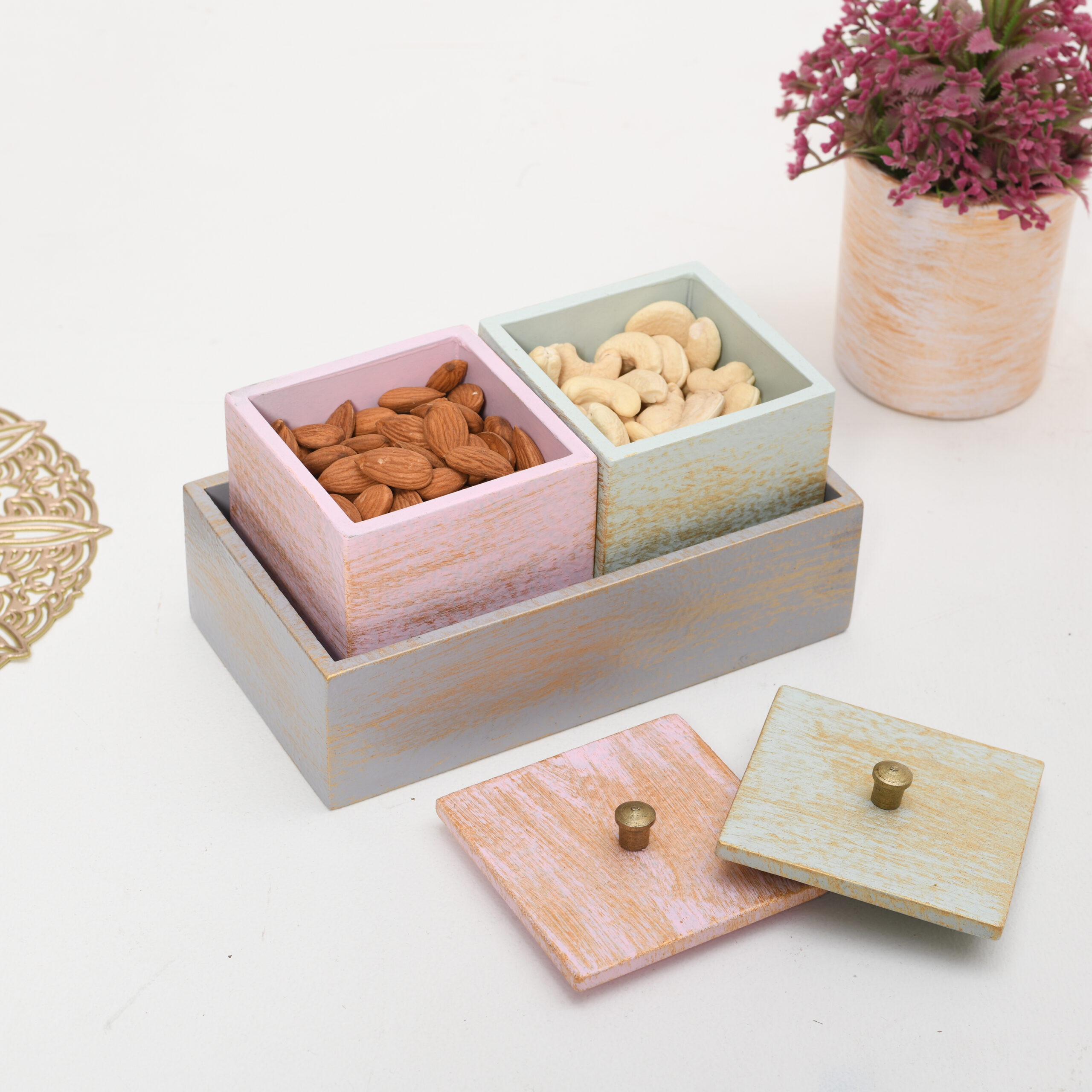 CRAFTMITRA Square Dry Fruit Storage Containers| Outside color silver | Premium MDF Serving Tray with 6 Multipurpose Snacks/Dry | Wooden Storage Box | MDF 6 Dry Fruit Storage Container with Lid (26L x 17W x 9H) Cms